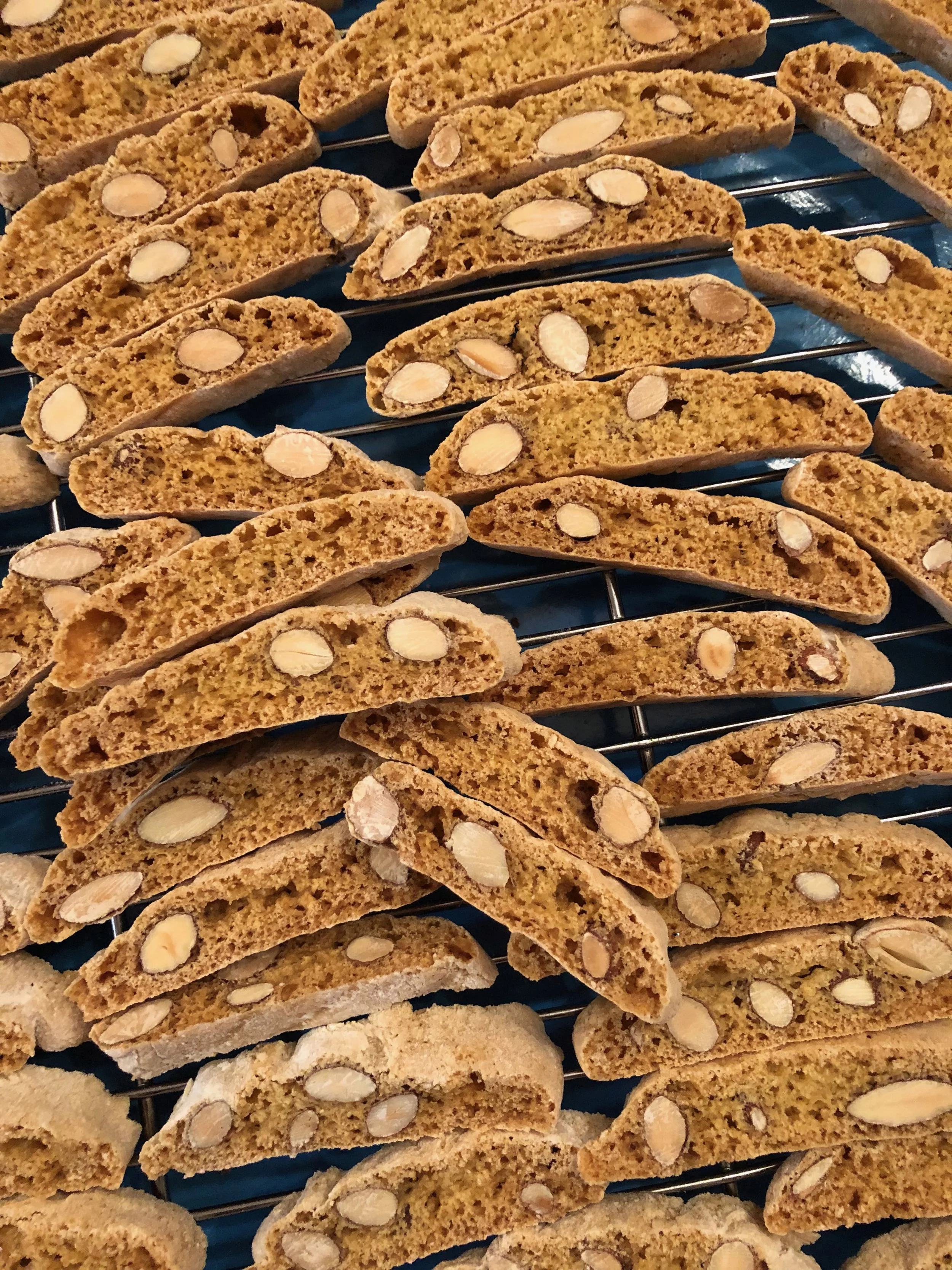 Biscotti are twice-baked cookies that are the perfect sweet with a cup of espresso or a glass of dessert wine after a great meal. There are all kinds out there these days, but these are the real deal: simple, authentic, good. It’s best to make this recipe on a dry day. If you’re going to serve the biscotti after a meal on a humid day, wait until just before serving to put them out. Dipping these in a cool glass of vin santo is definitely one of my favorite things.
